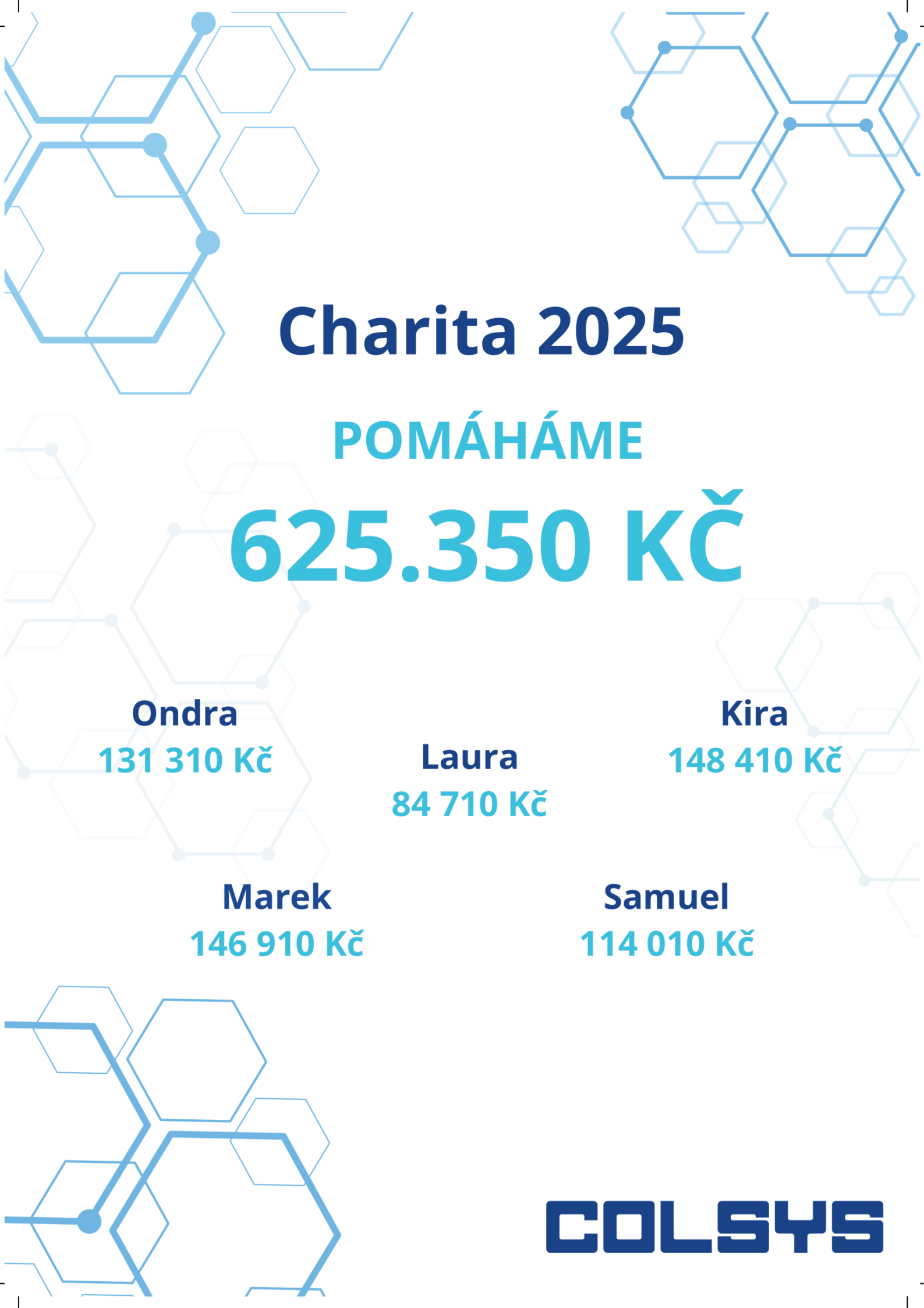 Díky společnému úsilí se podařilo vybrat 307 675 Kč. Colsys tuto částku zdvojnásobil, a celková suma pomoci tak dosáhla 615 350 Kč. Podpora směřovala ke konkrétním rodinám a jejich reálným potřebám – na zdravotní péči, pomůcky, rehabilitace i zlepšení životních podmínek. Nešlo o anonymní dar, ale o cílenou pomoc tam, kde má pomoc reálný dopad.